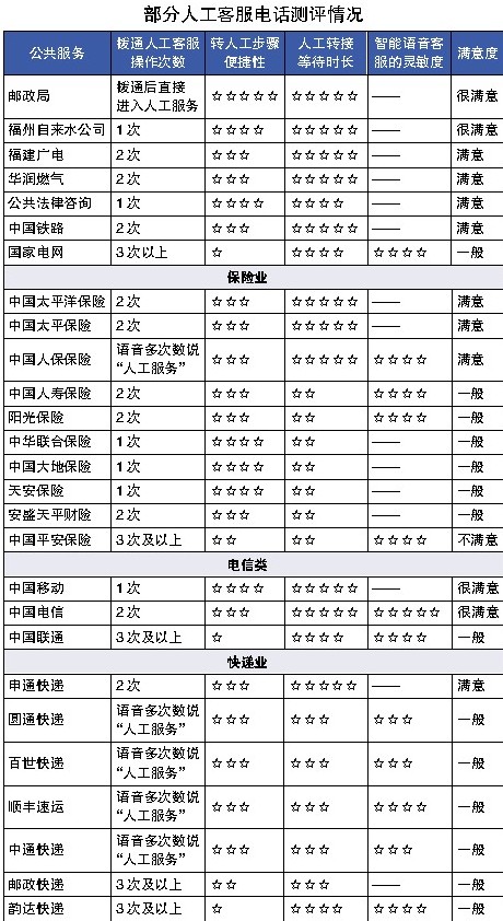部分人工客服电话测评情况