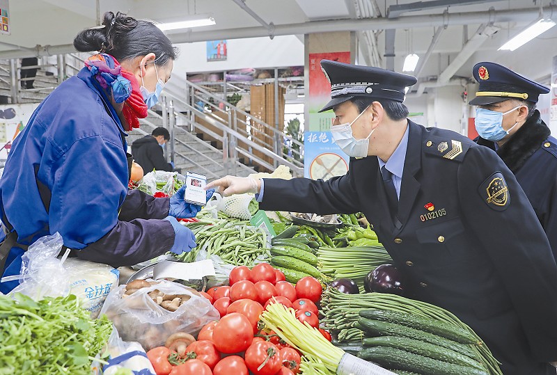 为切实杜绝疫情防控隐患,进一步织密织牢疫情防控网,北京市东城区市场监管局严格按照疫情防控工作要求,针对农贸市场等重点经营主体,持续做好从业人员核酸检测工作,对辖区农贸市场进行核酸检测 “周周检”。图为市场监管人员查看农贸市场内商户的核酸检测证明。