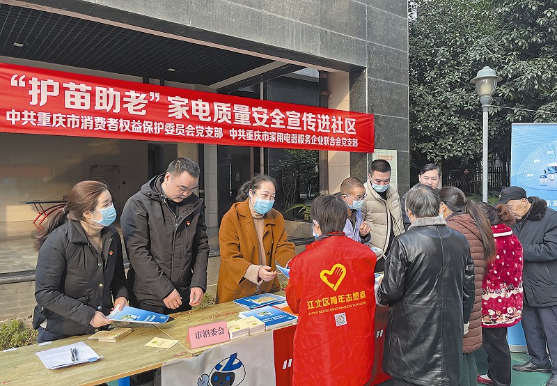 12月3日上午,中共重庆市消委会党支部联合重庆市家电服务企业联合会、江北区刘家台社区居委会,开展“护苗助老”家电质量安全宣传进社区党员志愿服务活动。 活动现场,重庆市消委会党支部党员志愿服务队向消费者介绍家电产品质量安全知识,提供消费维权咨询,发放《消费者权益保护法》等法律法规宣传资料。重庆市家电服务志愿服务队则免费为居民提供小家电维修、抽油烟机清洗、手机贴膜等服务。 向路 本报记者刘文新摄影报道