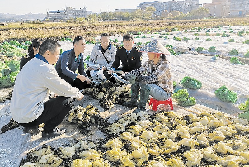 近日,广西钦州市市场监管局、灵山县市场监管局与当地盐业公司合作在灵山县开展“食盐安全进万家——我为群众办实事”宣传活动。图为市场监管人员深入田间地头向腌制酸菜的村民宣传食盐安全知识。