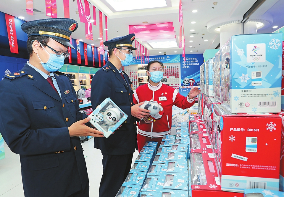 为进一步做好奥林匹克标志知识产权保护工作,北京市东城区市场监管局近期持续加大对涉及北京冬奥会、冬残奥会等官方标志和奥林匹克标志商品的监管执法力度,坚决杜绝各类侵权行为。图为执法人员对位于北京王府井工美大厦的北京2022官方特许商品零售店进行检查。本报记者董芳忠摄影报道