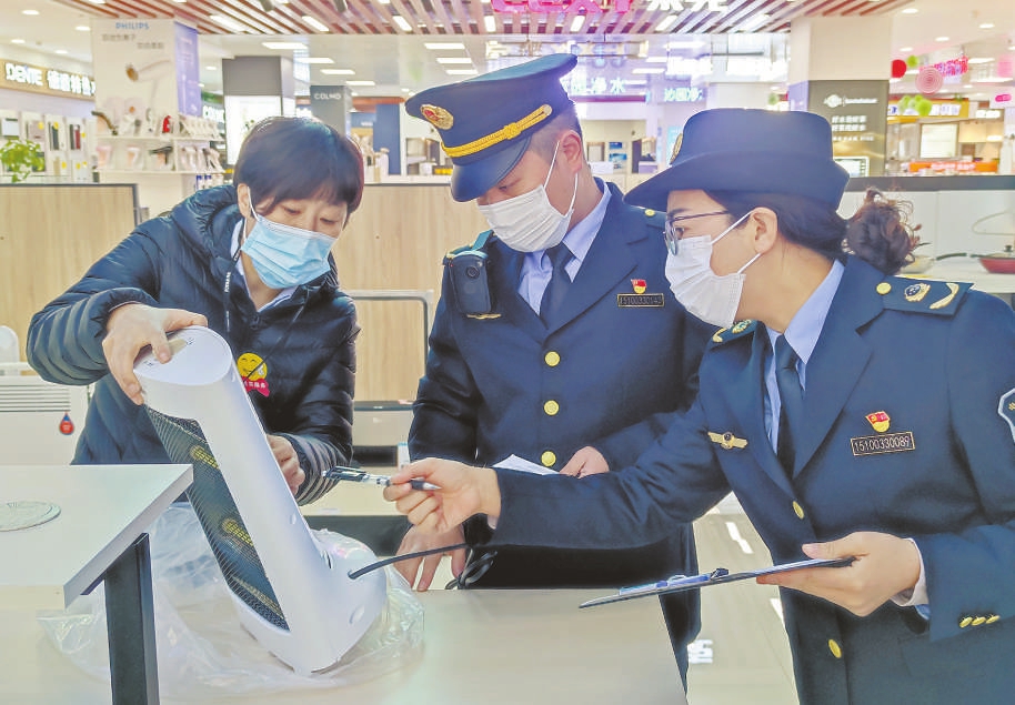 近日,山东省荣成市市场监管局开展了冬季电暖设备专项检查,防止不符合国家标准及行业标准的产品流入市场。图为执法人员在商超检查“小太阳”的3C认证标志。盛华杰 本报记者董芳忠摄影报道