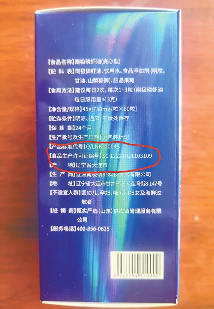 《中国消费者报》记者调查发现,该产品的生产商为辽渔南极磷虾科技发展有限公司,地址为大连市甘井子区大连湾街8—147号;经销商为甄实严选(山东)供应链管理服务有限公司(以下简称甄实严选),地址为山东省济南市槐荫区经十路24586号凯旋新城东地一块配套商业楼。食品类别为食用油、油脂及其制品;糖果制品。